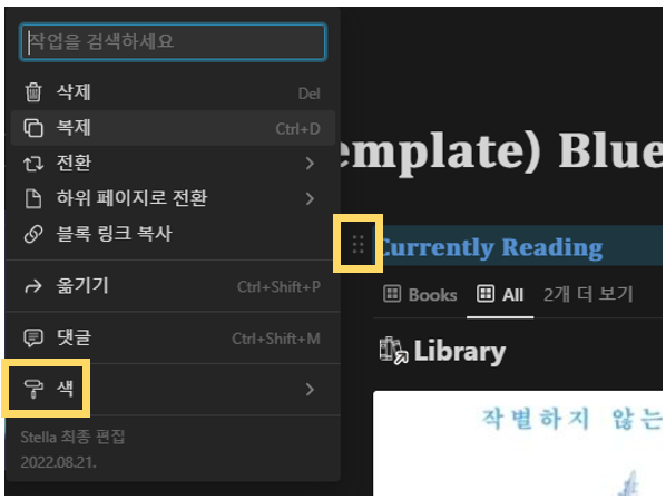 ๊ธฐ์กด์ ์๋ ์ฅ๋ฅด ์ค ์๋ฌด๊ฑฐ๋ ํ๋ ํด๋ฆญํ ๋ค ์๋ ํ์ด์ง์ ์๋ 'Library ๊ฐค๋ฌ๋ฆฌ ๋ฐ์ดํฐ๋ฒ ์ด์ค'๋ฅผ ๋๋๊ทธ(or ๋ง์ฐ์ค ์ปค์ ๊ฐ๋ค ๋๋ฉด ๋์ค๋ ์ 6๊ฐ ํด๋ฆญ) ํ ํ ๋ณต์ฌ(Ctrl + c)ํ๊ณ , ์๋ก ๋ง๋ค ๋ด ์ฅ๋ฅด ํ์ด์ง์ ๋ถ์ฌ ๋ฃ๊ธฐ(Ctrl + v) ํด ์ค๋๋ค(๋ถ์ฌ ๋ฃ๊ธฐ ํ๋ฉด '๋ถ์ฌ ๋ฃ๊ธฐ'์ '๋ถ์ฌ ๋ฃ๊ณ ๋๊ธฐํํ๊ธฐ'๊ฐ ๋จ๋๋ฐ '๋ถ์ฌ ๋ฃ๊ธฐ' ์ ํํด์ฃผ์ธ์).