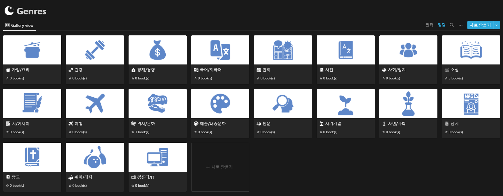 ๐'+ ์๋ก ๋ง๋ค๊ธฐ' ํด๋ฆญ > ์ ๋ชฉ&์์ด์ฝ&์ปค๋ฒ ์ฌ์ง ์ค์ > ๋ค๋ฅธ ์ฅ๋ฅด ํ์ด์ง ์์ ์๋ 'Library ๊ฐค๋ฌ๋ฆฌ ๋ฐ์ดํฐ๋ฒ ์ด์ค' ๋ณต์ฌ > ์๋ก ๋ง๋ ์ฅ๋ฅด ํ์ด์ง์ ๋ถ์ฌ ๋ฃ๊ธฐ > 'ํํฐ' ํด๋ฆญ > '๊ท์น 1๊ฐ' ํด๋ฆญ > '์ปดํจํฐ/IT' ํด๋ฆญ > '์ปดํจํฐ/IT' X ๋๋ฌ์ ์ญ์ > '์๋ก์ด ์ฅ๋ฅด' ํด๋ฆญ > '๋ชจ๋์๊ฒ ์ ์ฅ' ํด๋ฆญ