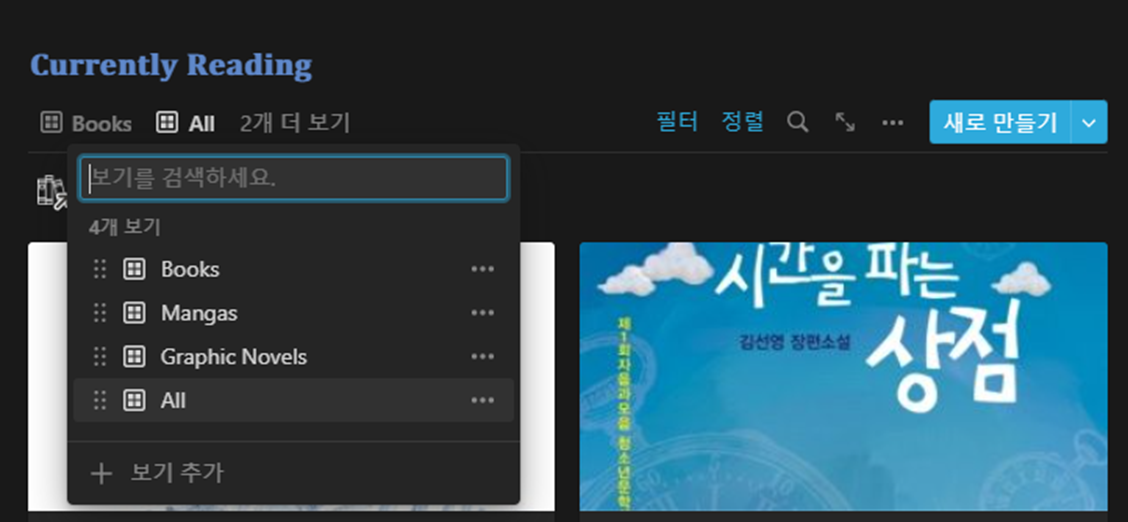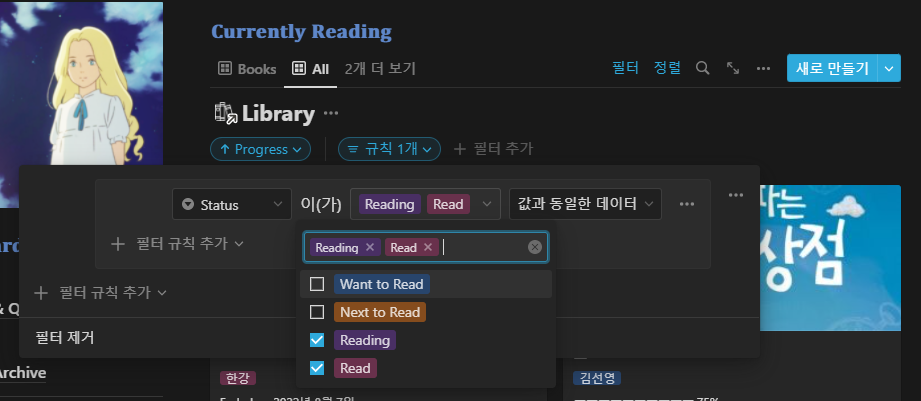 'Currently Reading' ์ชฝ์ ๋ง์ฐ์ค ์ปค์๋ฅผ ๊ฐ๋ค ๋๋ฉด 'ํํฐ' ๋ฒํผ์ด ์๊น๋๋ค. 'ํํฐ'๋ฅผ ๋๋ฅด๋ฉด ๋ค์ ์๋์ 'Progress' ๋ฒํผ๊ณผ '๊ท์น 1๊ฐ' ๋ฒํผ์ด ์๊ธฐ๋๋ฐ ์ด ์ค์ '๊ท์น 1๊ฐ' ๋ฒํผ์ ๋๋ฌ์ฃผ์ธ์. ๊ทธ๋ผ 'Status'๊ฐ 'Reading'์ '๊ฐ๊ณผ ๋์ผํ ๋ฐ์ดํฐ'๋ก ์ง์ ๋์ด ์์ ํ ๋ฐ ์ด ์ค์ 'Reading'์ผ๋ก ์ง์ ๋ ๋ถ๋ถ์ 'Read'๋ ์ถ๊ฐํด์ฃผ์ธ์. ๊ทธ๋ฌ๋ฉด ํ์ฌ ์ฝ๊ณ ์๋ ์ฑ ๋ง ๋ณด์ด๋ ๊ฒ ๋ค ์ฝ์ ์ฑ ๋ ํจ๊ป ๋ณด์ด๊ฒ ๋ฐ๋๋๋ค. ํํฐ ์ง์ ์ด ๋ค ๋๋๋ฉด ๋ค์ 'ํํฐ' ํด๋ฆญํด์ ์ฐฝ ๋ซ์์ฃผ์ธ์!