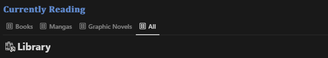 ๋ค์์ผ๋ก โฅ'Currently Reading' ํํฐ๋ฅผ ์ข ๋ค๋ฅด๊ฒ ์ง์ ํ์ต๋๋ค. 'Books'๋ง ๋ณด์ด๋ ๊ฒ์ ๋ชจ๋ ์ข ๋ฅ์ ์ฑ ์ด ํ ๋ฒ์ ๋ค ๋ณด์ด๋๋ก, ํ์ฌ ์ฝ๊ณ ์๋ ์ฑ ๋ง ๋ณด์ด๋ ๊ฒ์ ๋ค ์ฝ์ ์ฑ ๋ ๊ฐ์ด ๋ณด์ด๋๋ก ๋ณ๊ฒฝ ์ง์ ํ์ต๋๋ค(์ด๋ฆ์ด 'Currently Reading'์ด๋ผ ํ์ฌ ์ฝ๋ ์ค์ธ ์ฑ ๋ง ์ง์ ํด ๋๋ ๊ฒ ๋ง์ง๋ง ์ ๋ ๋ค ๋ณด์ด๊ฒ ํ๋ ๊ฒ ๋ ๊ฐ๋ ์ฐจ ๋ณด์ด๊ณ ์ข๋๋ผ๊ตฌ์๐).