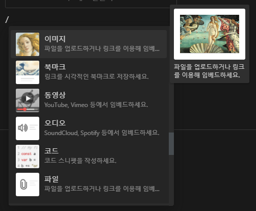 ์ด๋ฏธ์ง ๋ธ๋ก ๋ฃ๋ ๋ฐฉ๋ฒ์ ์ํ๋ ๋ถ๋ถ ๋น ๊ณณ์ ํด๋ฆญํ ๋ค์ '/(์ฌ๋ผ์ด๋)'๋ฅผ ์ ๋ ฅํ๊ณ ์คํฌ๋กค์ ์ญ ๋ด๋ฆฌ์ ์ '์ด๋ฏธ์ง' ์ ํํด์ฃผ์๋ฉด ๋ฉ๋๋ค. ์คํฌ๋กค ๋ด๋ฆฌ๋ ๋ฐฉ๋ฒ ์ธ์ ์ด๋ฏธ์ง ์ฐพ๋ ๋ฐฉ๋ฒ์ /(์ฌ๋ผ์ด๋) ์ ๋ ฅ ํ '์ด๋ฏธ์ง'๋ผ๊ณ ์น์๊ฑฐ๋ 'picture'์ด๋ผ๊ณ ์น๋ ๋ฐฉ๋ฒ์ด ์์ต๋๋ค(๐์คํฌ๋กค ๋ด๋ ค์ ์ง์ ์ฐพ๊ธฐ or /์ด๋ฏธ์ง or /picture ์ ๋ ฅ)