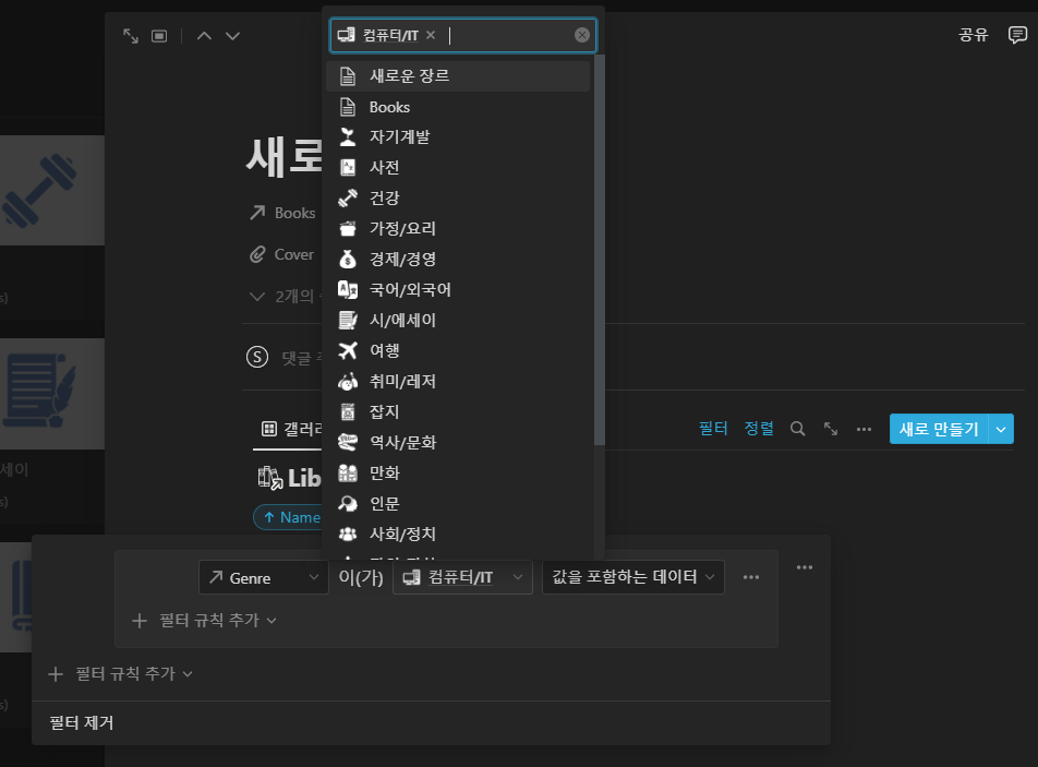 ์ ๊ฐ '์ปดํจํฐ/IT' ์ฅ๋ฅด์์ ๋ณต์ฌํด์๊ธฐ ๋๋ฌธ์ ํํฐ๋ฅผ ๋ณด๋ฉด '์ปดํจํฐ/IT'๋ก ์ค์ ๋์ด์๋๋ฐ '์ปดํจํฐ/IT' ์ง์ ๋ ๋ถ๋ถ์ ์ญ์ ํ๊ณ ์๋ก ๋ง๋ ์ฅ๋ฅด๋ฅผ ์ถ๊ฐํด์ค๋๋ค. ํํฐ๋ฅผ ์ง์ ํ๋ ๊ณผ์ ์ ๊ฑฐ์น๊ธฐ ์ ์ ์๋ก ๋ง๋ ์ฅ๋ฅด ํ์ด์ง์ ์ ๋ชฉ์ ๊ผญ ๋จผ์ ์ ์ด์ฃผ์ธ์. ๊ทธ๋์ผ์ง ํํฐ๋ง ์ง์ ํ ๋ ๊ณ ๋ฅด๊ธฐ ์ข์ต๋๋ค(์ ๋ชฉ์ ์ ์ฐ๋ฉด ์๋ง '์ ๋ชฉ ์์'์ด๋ผ๋ ๊ฒ ํํฐ๋ง ๋ชฉ๋ก์ ๋ฐ ๊ฑฐ์์). ์ ๋ ํ์ด์ง ์ ๋ชฉ์ '์๋ก์ด ์ฅ๋ฅด'๋ผ๊ณ ์ ์ด ๋์์ ์ ๋ ๊ฒ ๋น๋๋ค.