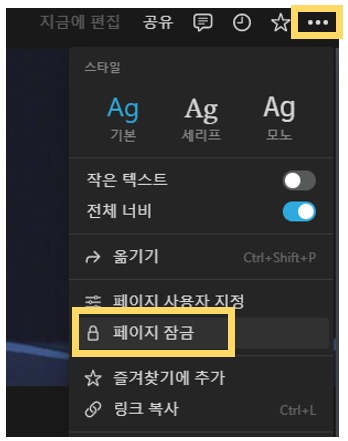 ๋ฉ์ธ ํ์ด์ง ๋งจ ์ ์ค๋ฅธ์ชฝ ๋ชจ์๋ฆฌ์ ' โ โ โ (๋๋ณด๊ธฐ) ' ํ์๋ฅผ ํด๋ฆญํ์๋ฉด 'ํ์ด์ง ์ ๊ธ'์ด ์์ต๋๋ค. ๋ ์ด์ ํ์ด์ง๋ฅผ ํธ์งํ์ง ๋ชปํ๊ฒ ๋ง๋ ์ญํ ์ ํ๊ณ ํด๋ฆญํ์๋ฉด '+ ์๋ก ๋ง๋ค๊ธฐ' ๋ฐ์ค๋ค์ด ์ฌ๋ผ์ง๋๋ค!